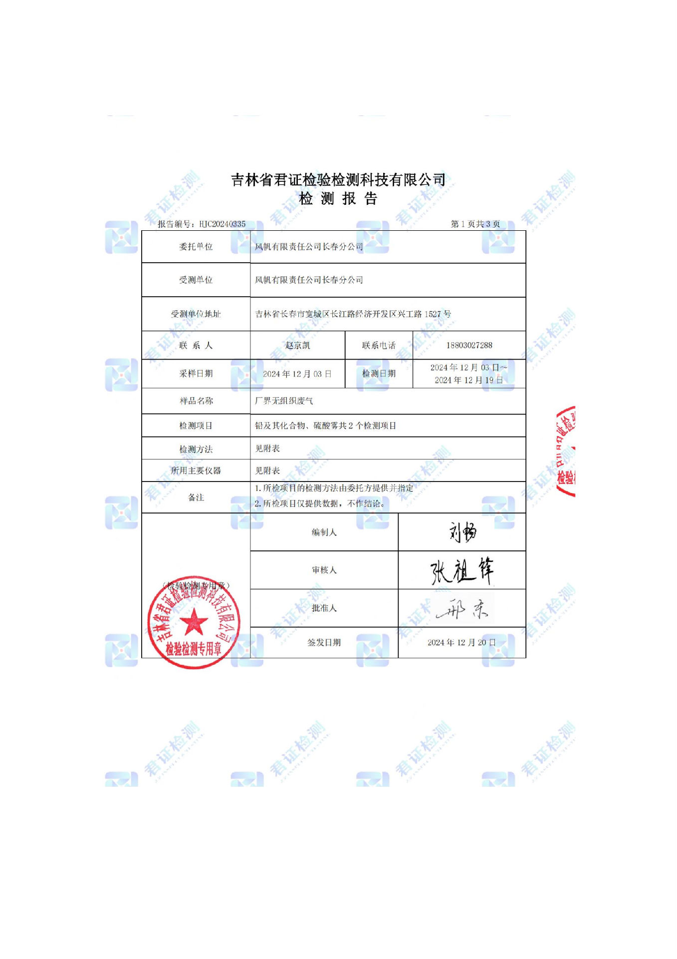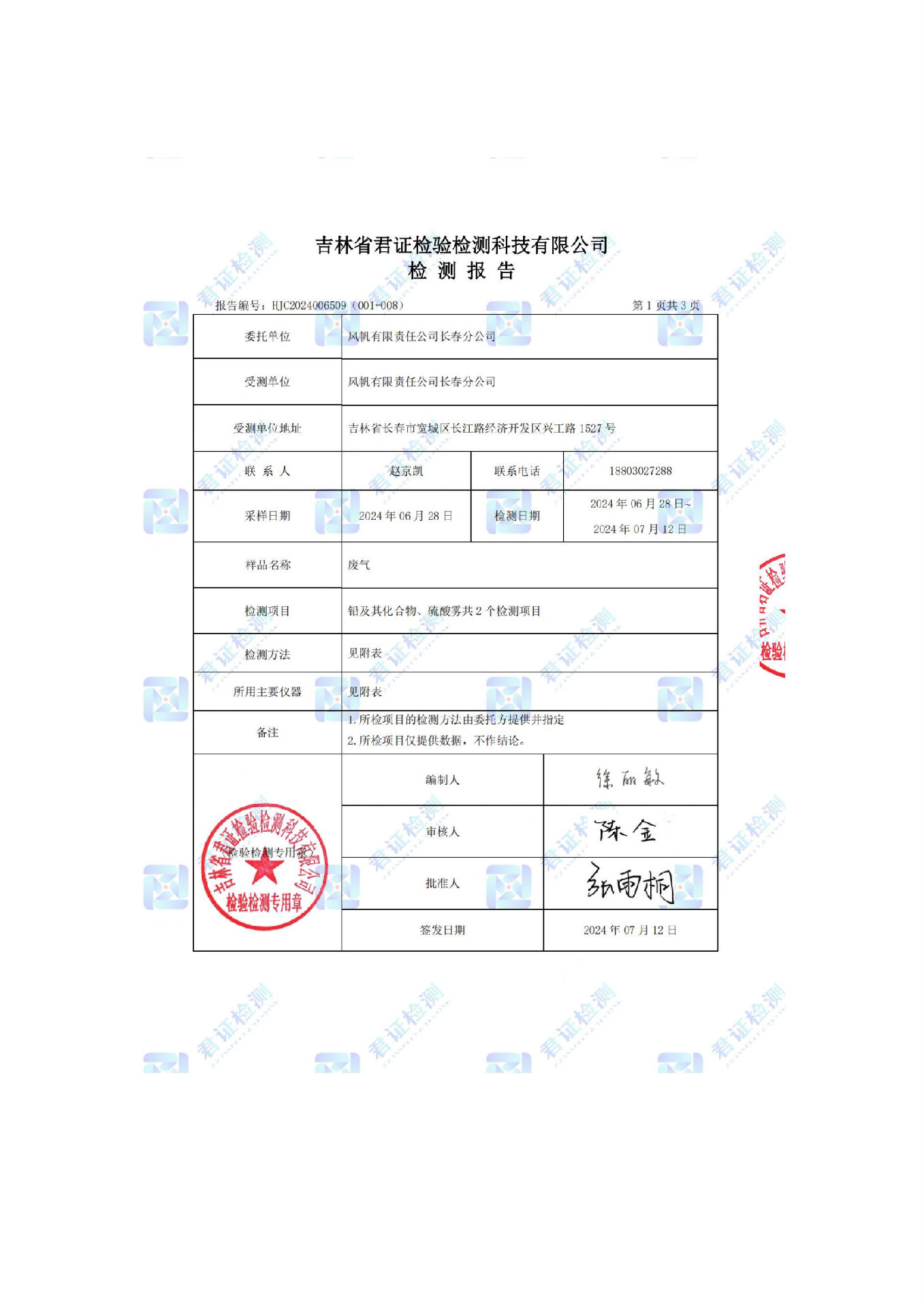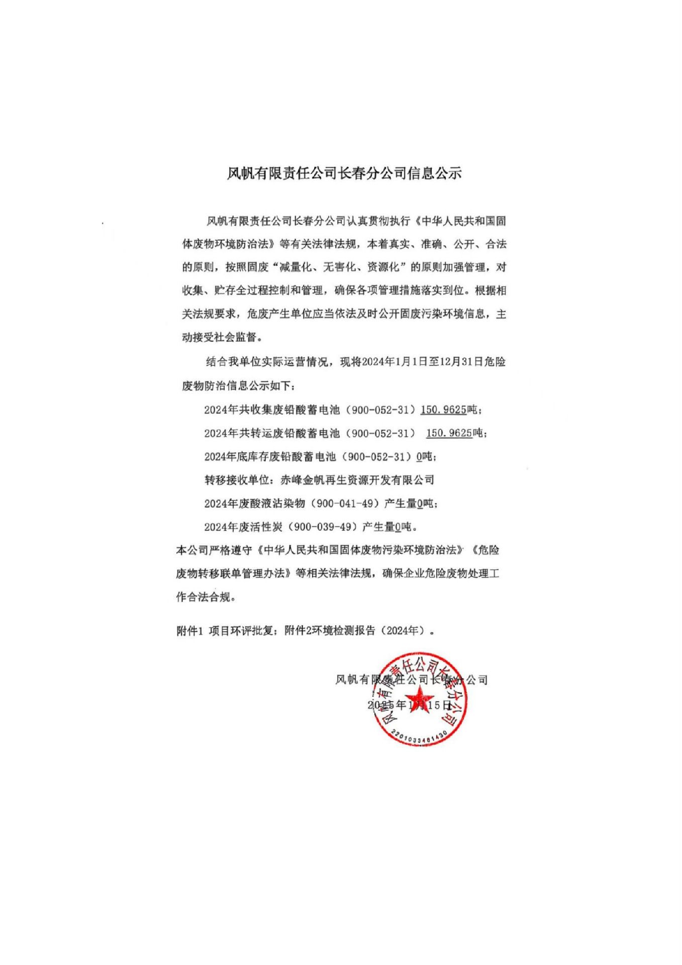 風(fēng)帆有限責(zé)任公司長春分公司2024年危險(xiǎn)廢物污染防治信息公示